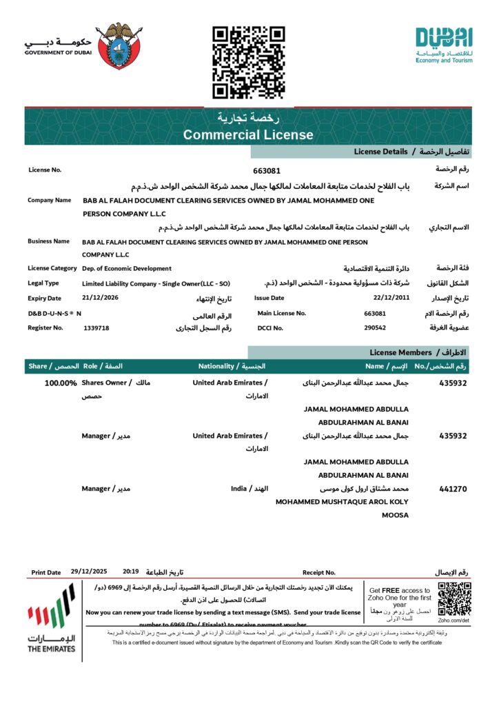 | Business Name | BAB AL FALAH DOCUMENT CLEARING SERVICES OWNED BY JAMAL MOHAMMED ONE PERSON COMPANY L.L.C |